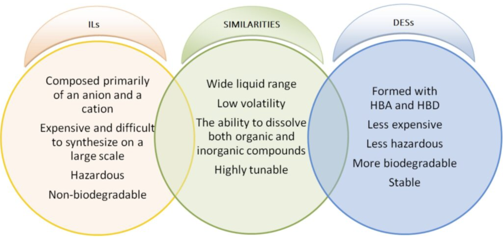 Figure 1. A comparison of the similarities and differences in the defining characteristics of ILs and DESs (Płotka-Wasylka et al. 2020). While they are very similar, the most pertinent difference (aside from melting point characteristics) lies in the type of coordination between constituent molecules, with ILs involving an ionic bond between an anion and cations, while DESs involve hydrogen bonding due to the constituents acting as hydrogen bond donors (HBD) and hydrogen bond acceptors (HBA). Note that many ILs can be biodegradable and/or non-hazardous, however this is less frequent than with DESs.