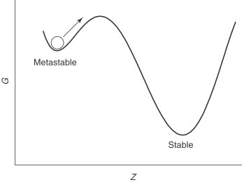 Figure 2. Energy diagram  of a metastable vs stable equilibrium. The Gibbs free energy (G), is plotted against the reaction progress (z). Diamonds exist at a metastable equilibrium and graphite at stable equilibrium (Perepezko 2005).
