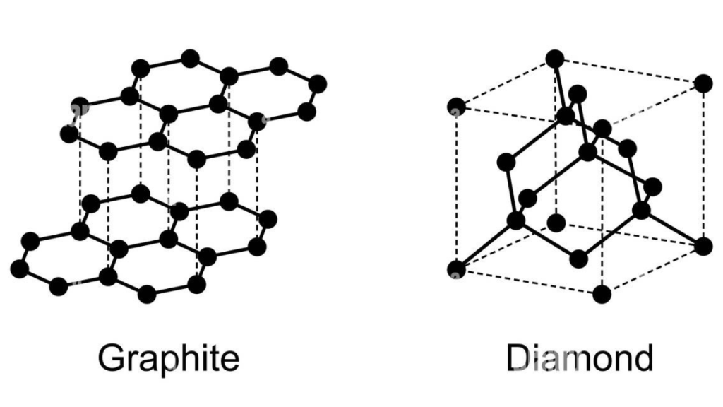 Figure 1. Graphite’s 2-D hexagonal sheet structure, compared to diamonds 3-D tetrahedral structure. Covalent bonds are represented by solid lines, and the Van der Waals forces between graphite’s hexagonal sheet layers are represented by dotted lines (East Carbon 2024).
