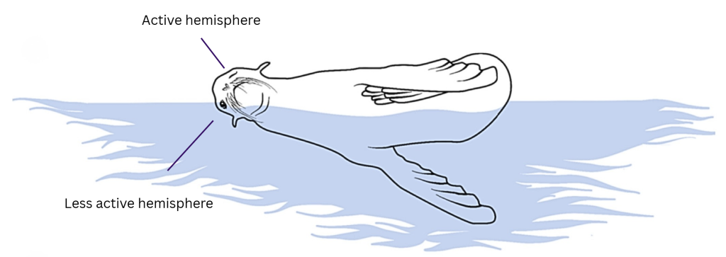 Beyond these physiological concerns, unihemispheric slow-wave sleep (USWS) addresses the threat of predators. Steller Sea Lions (Eumetopias jubatus) and Killer Whales (Orcinus orca) swim near the surface of the water (Kendall-Barr et al. 2019). They approach silently and no auditory cues can provide warning. Instead, the seals rely on their more active brain hemisphere to process visual information from the open eye (Figure 1). This eye scans the surroundings for threats about 8 times per minute and is open for about 1.9 seconds each time (Kendall-Barr et al. 2019). Such vigilance is not unique to northern fur seals; many other mammals including humans monitor surroundings for threats while asleep.
