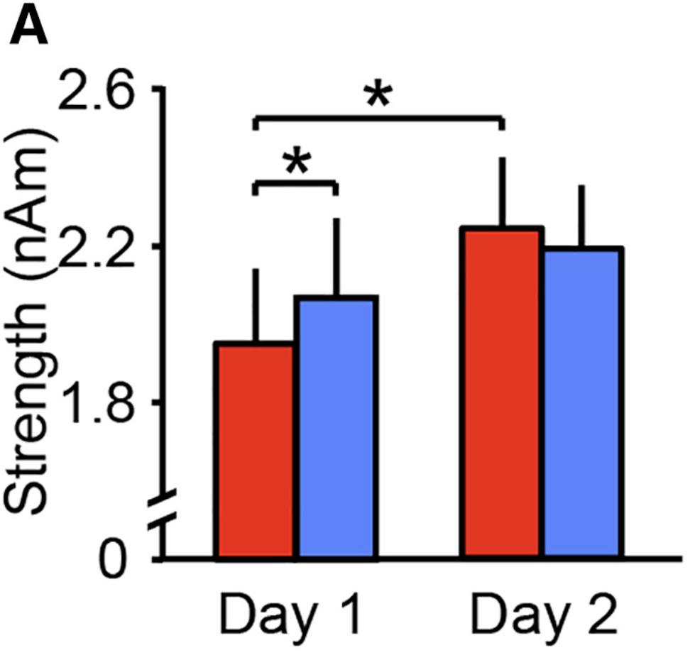 Figure 2: The strength of the slow-wave activity of the default mode network of the brain (Tamaki et al. 2016). This is a group of connected brain regions including the prefrontal cortex that are active during passive, low cognitive demand tasks and sleep (Tashjian et al. 2018). The left hemisphere (red) on the first night exhibits significantly weaker activity compared to the right hemisphere (blue) on the first night and the left hemisphere on the second night, as denoted by the asterisk.