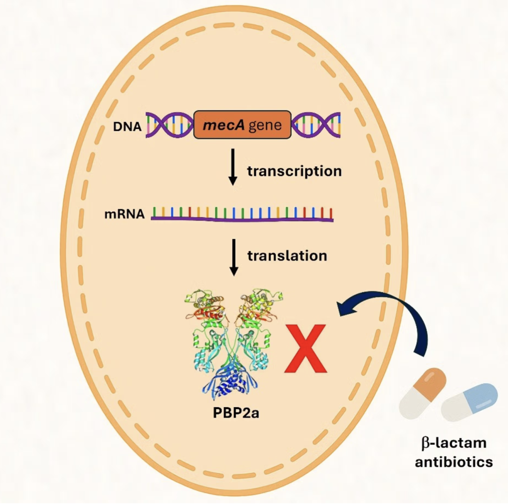 Figure 1. Genetic Mechanism of the mecA gene in MRSA. The gene encodes PBP2a, as opposed to the original PBPs targeted by b-lactam antibiotics, PBP2a has a lower affinity these antimicrobials. b-lactam antibiotics inhibit bacterial formation by binding to PBPs and disrupting cell wall synthesis. Due to the presence of PBP2a, Staphylococcus aureus is able to bypass the inhibition, allowing cell wall synthesis in the presence of b-lactam antibiotics (“Antimicrobial Resistance and the MRSA Crisis: A Silent Pandemic Demanding Urgent Global Action” 2025).