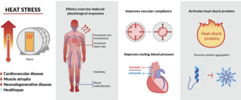 On a cellular level, exposure to heat stress stimulates the production of heat shock proteins which help protect cells from damage and support protein repair mechanisms (Hu et al. 2022). In addition, sauna bathing has been associated with increased nitric oxide availability, reduced oxidative stress, and decreased inflammation pathways in the body (Henderson et al. 2021). These physiological responses contribute to improved endothelial function and better metabolic regulation, including increased insulin sensitivity. Such adaptations may explain why regular sauna use is linked to improved metabolic health and reduced risk of chronic diseases.