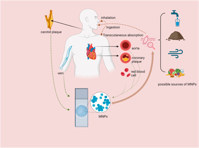 Microplastics enter the human body through a variety of ways, the main ones being ingestion, inhalation and dermal exposure (Figure 1)(Sun and Wang 2023). Through ingestion, microplastics are found in bottled water, tap water, seafood and even crops grown in contaminated soil (Ziani et al. 2023). Additionally, heating food in plastic containers releases microplastics (Ziani et al. 2023). Through inhalation, microplastics from synthetic textiles get stirred in the air and are inspired by humans. This could be from vehicle tires, urban dust, synthetic furniture and carpets within homes (Saha and Saha 2024). Lastly, polyester clothing sheds plastic fibres during washing and wearing (Saha and Saha 2024). Cosmetic products such as toothpaste, bodywash and makeup contain microbeads, causing further dermal absorption (Canada 2015).